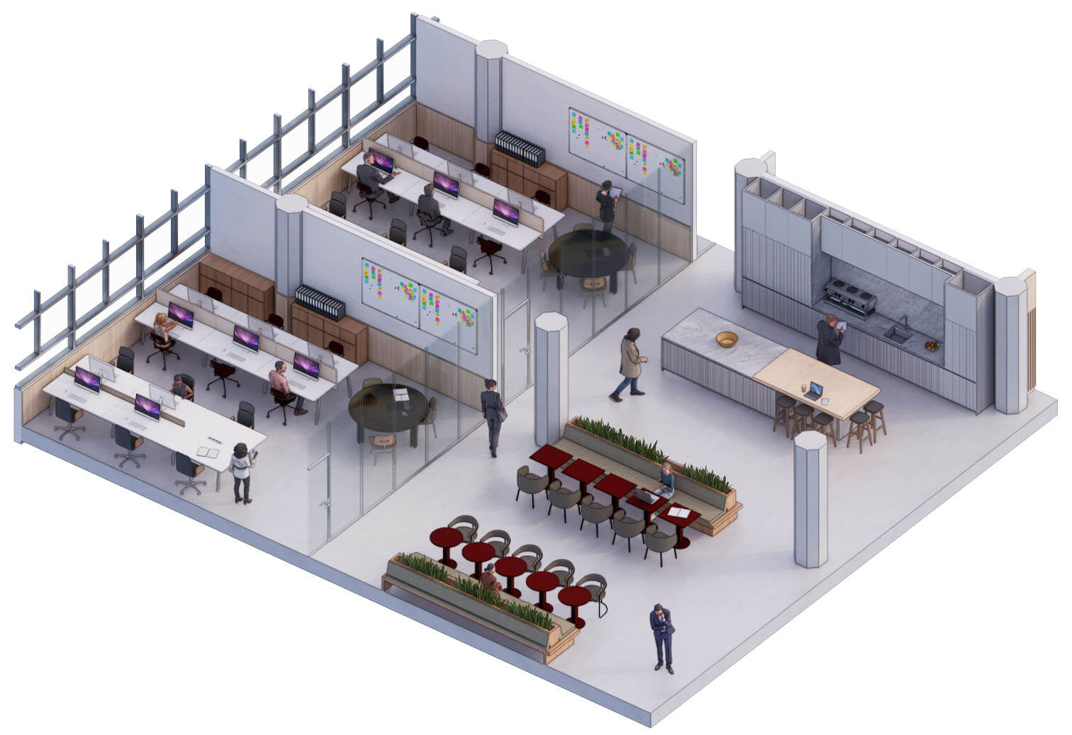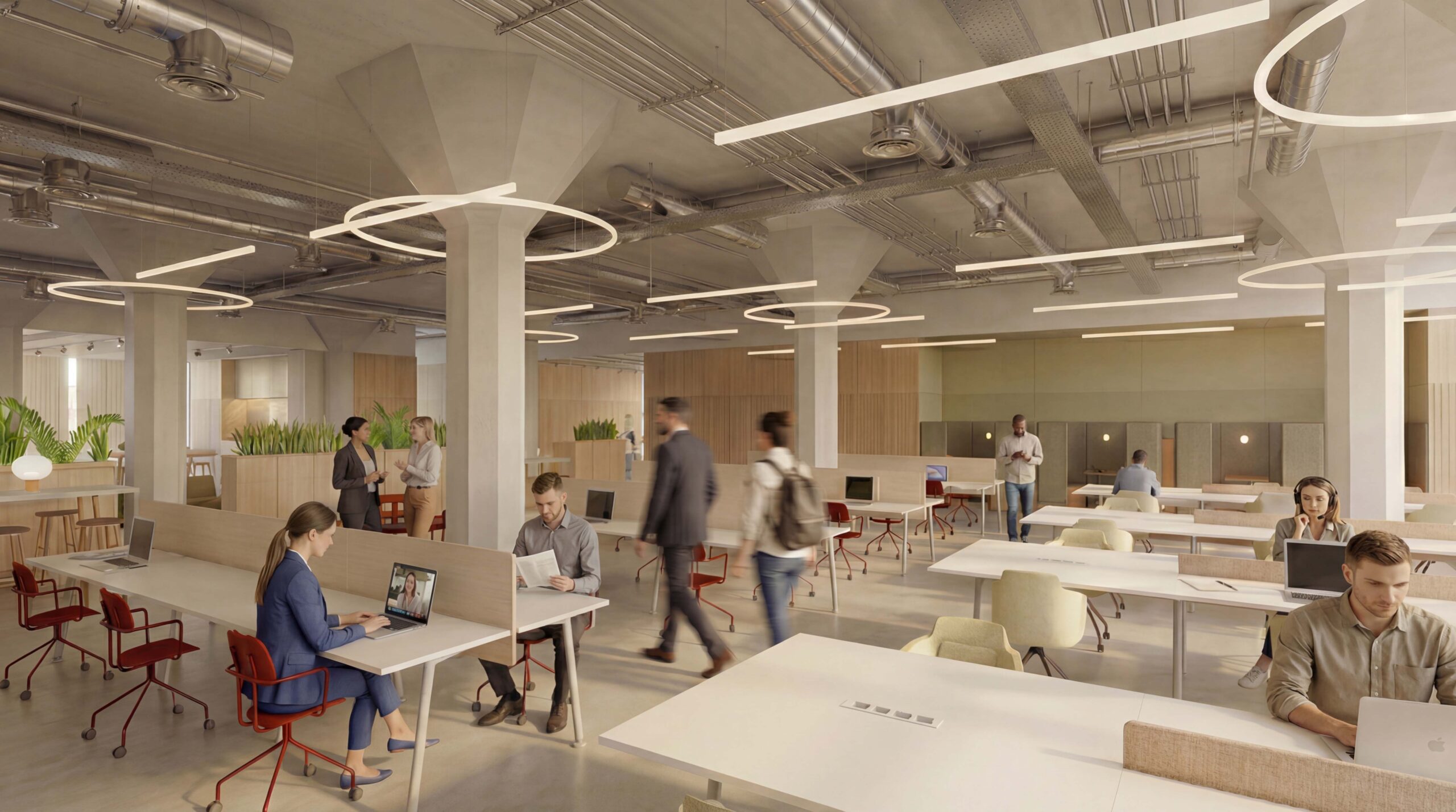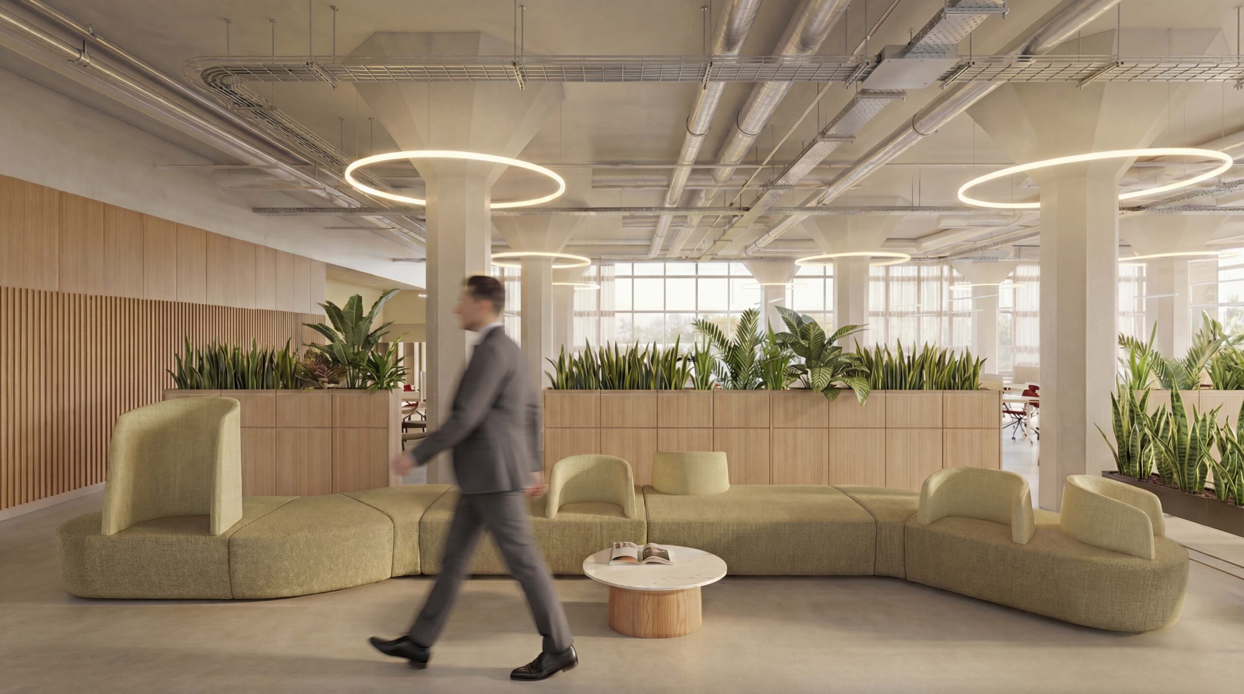 The existing concrete structure, characterized by distinctive octagonal columns, serves as the backbone of our design. We seamlessly integrated these elements into a modern, vibrant workspace that pays homage to the industrial charm of its historic roots, flooded with character and natural light.