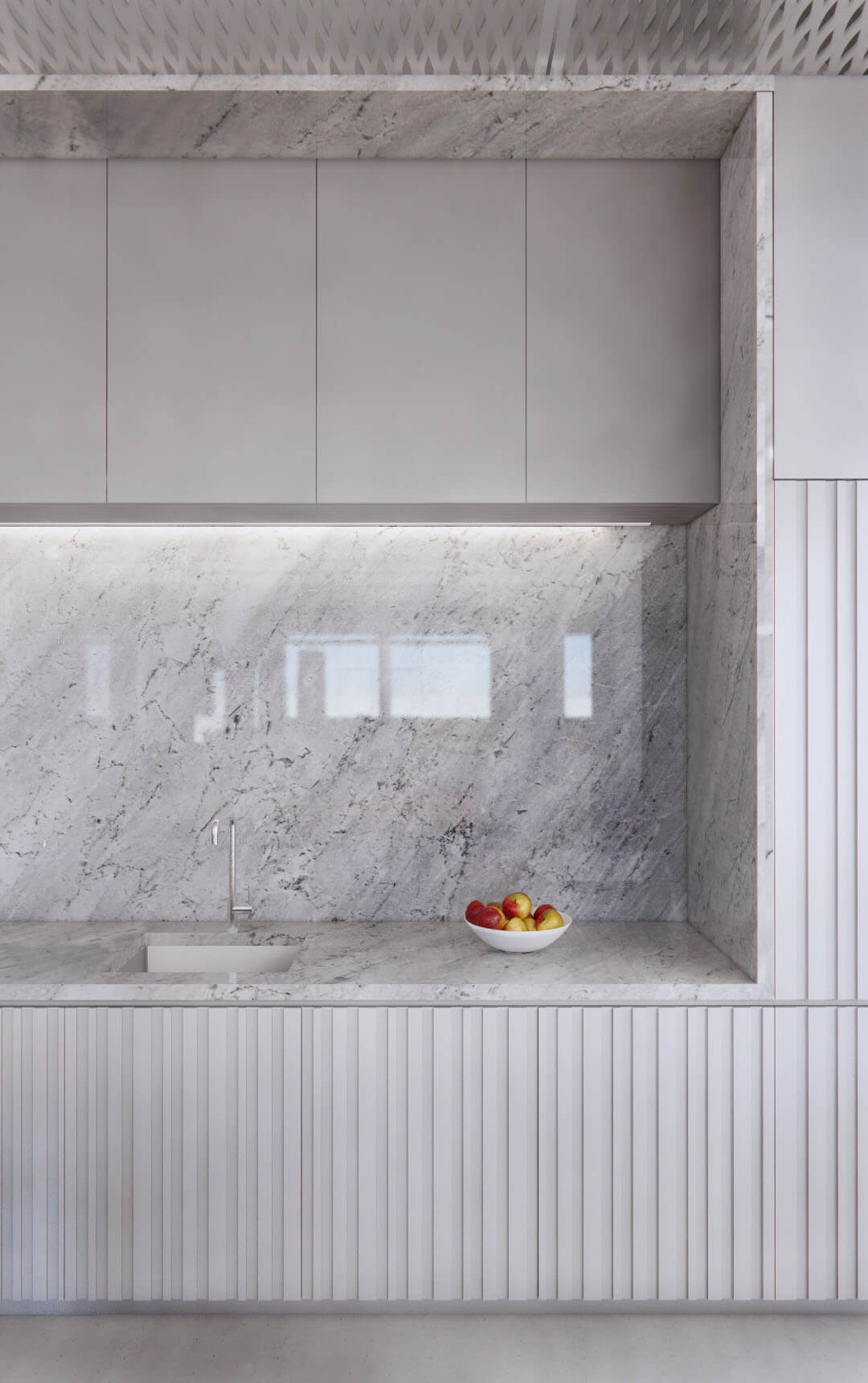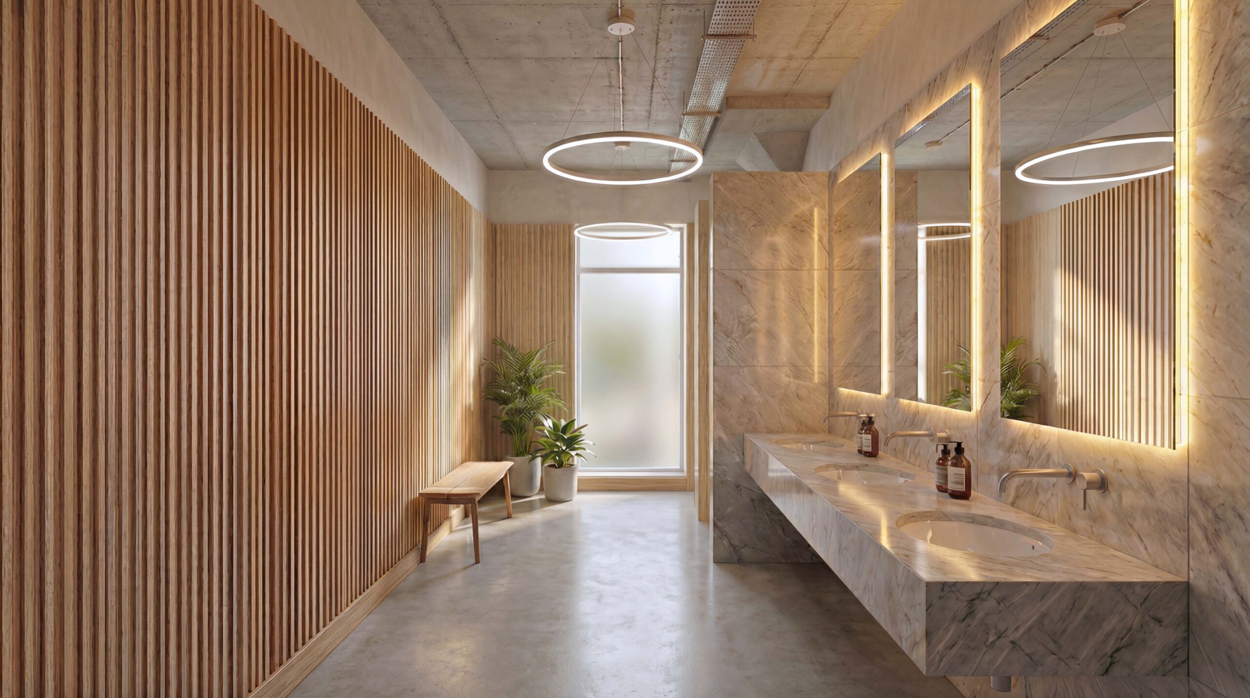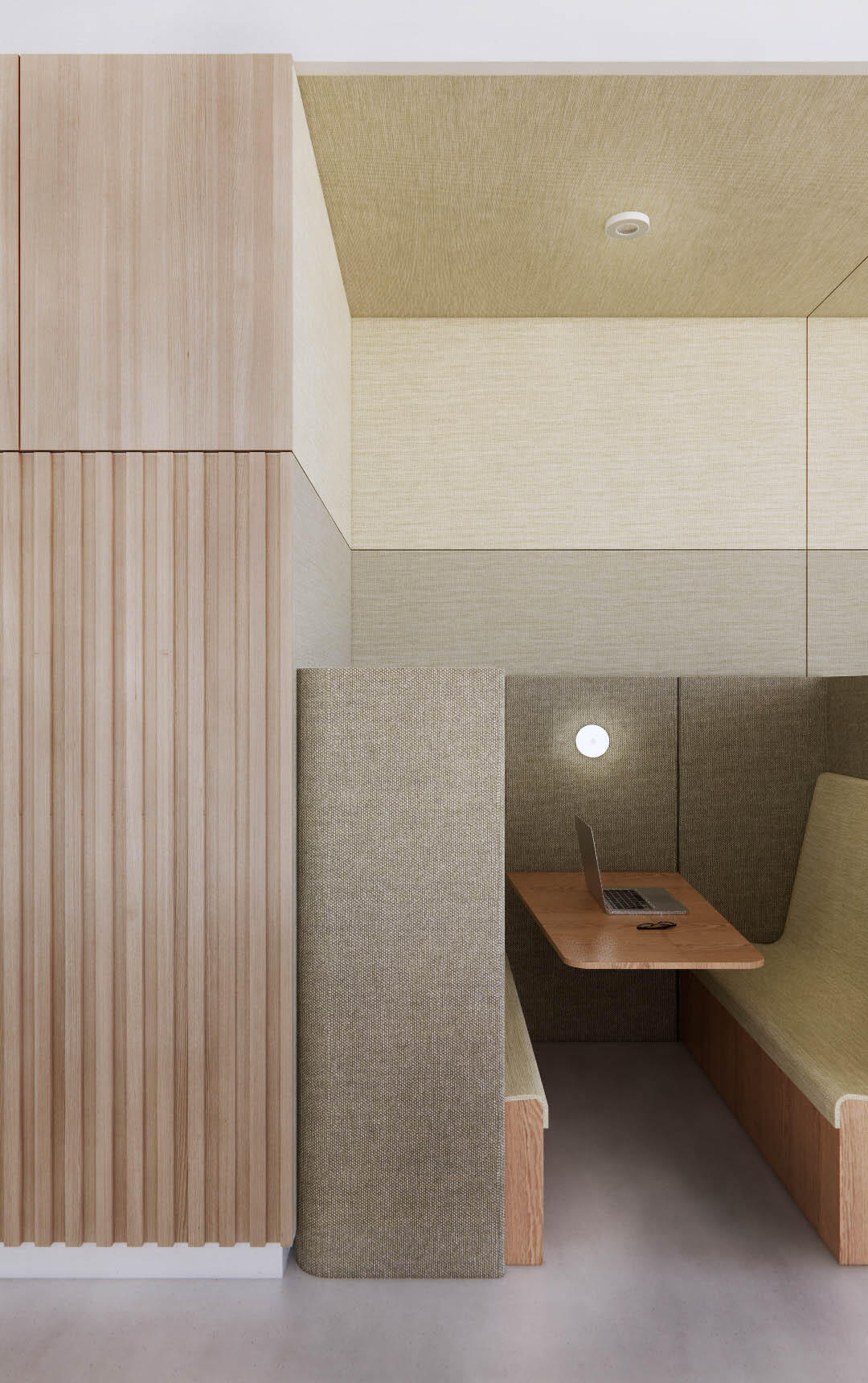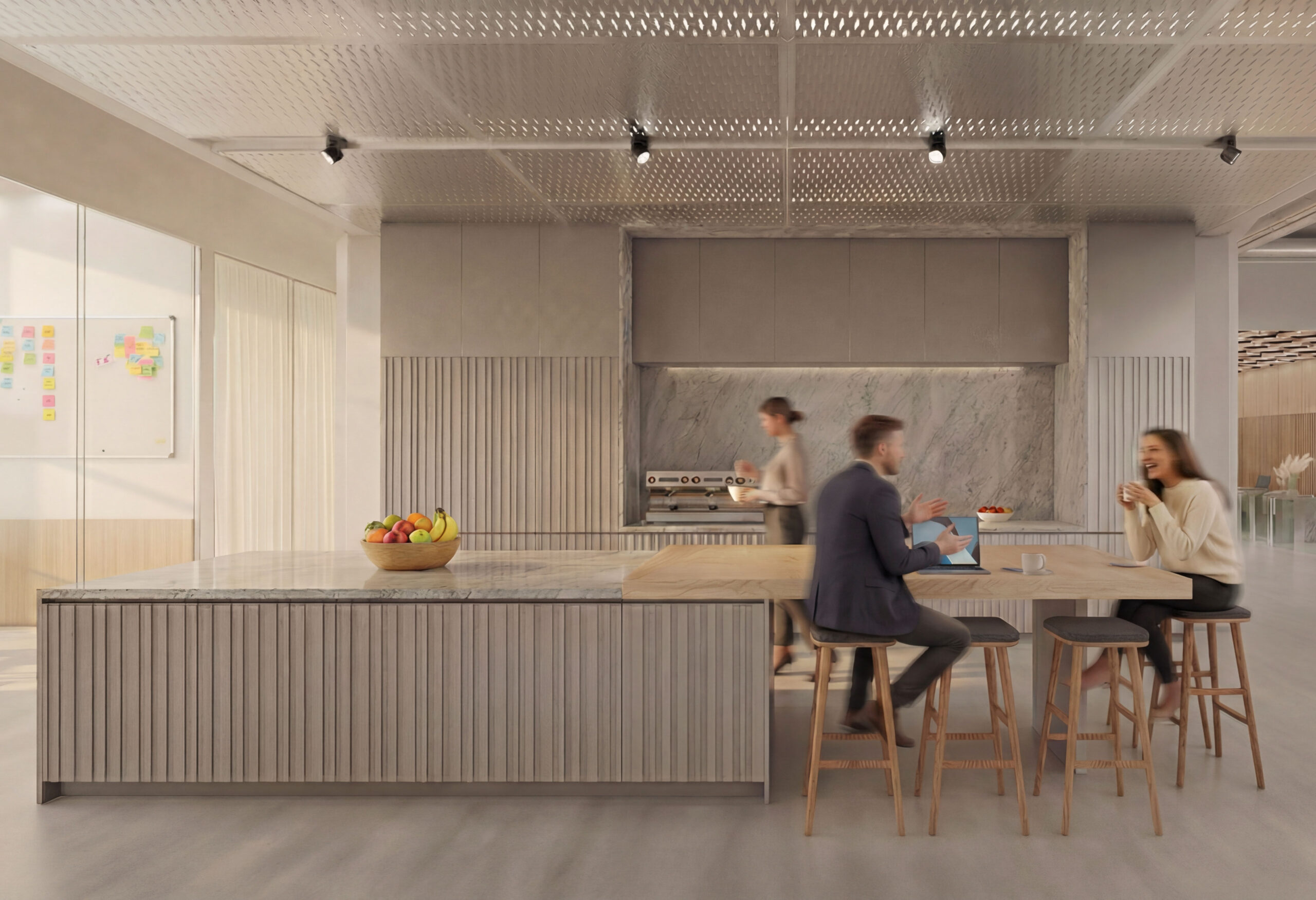 The carefully chosen materials—polished concrete, slatted oak, premium fabrics, and expanded metal meshes—harmonize effortlessly with the building's historical features, creating a cohesive and visually stunning environment.