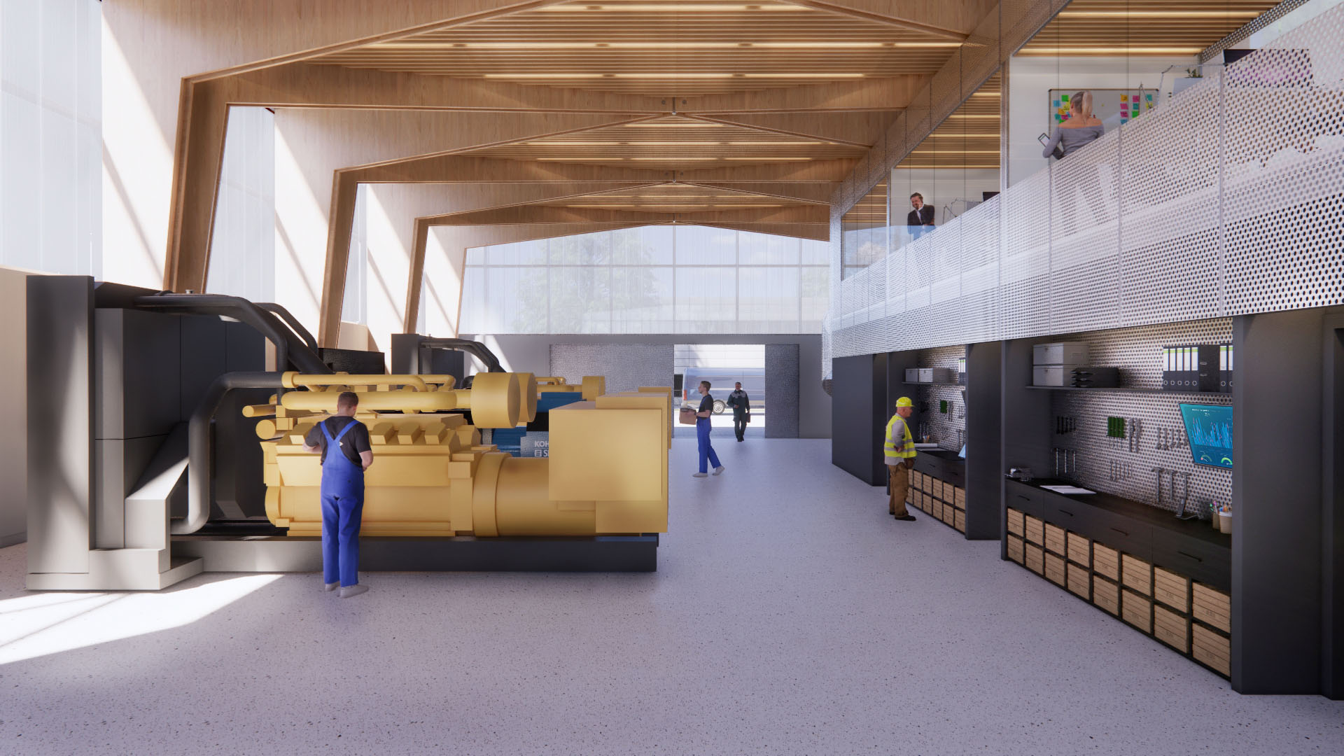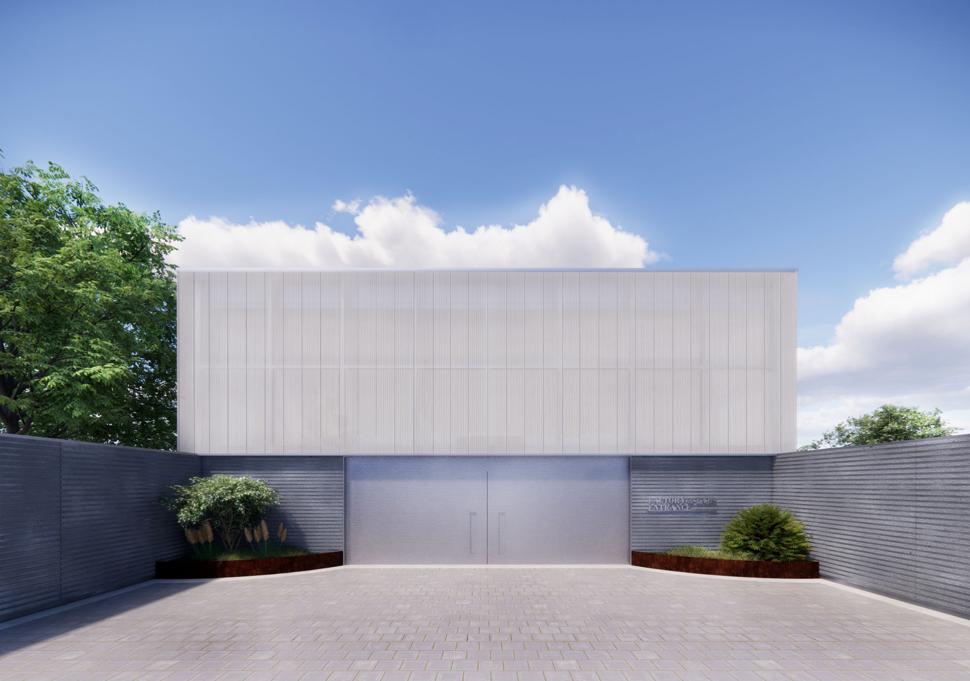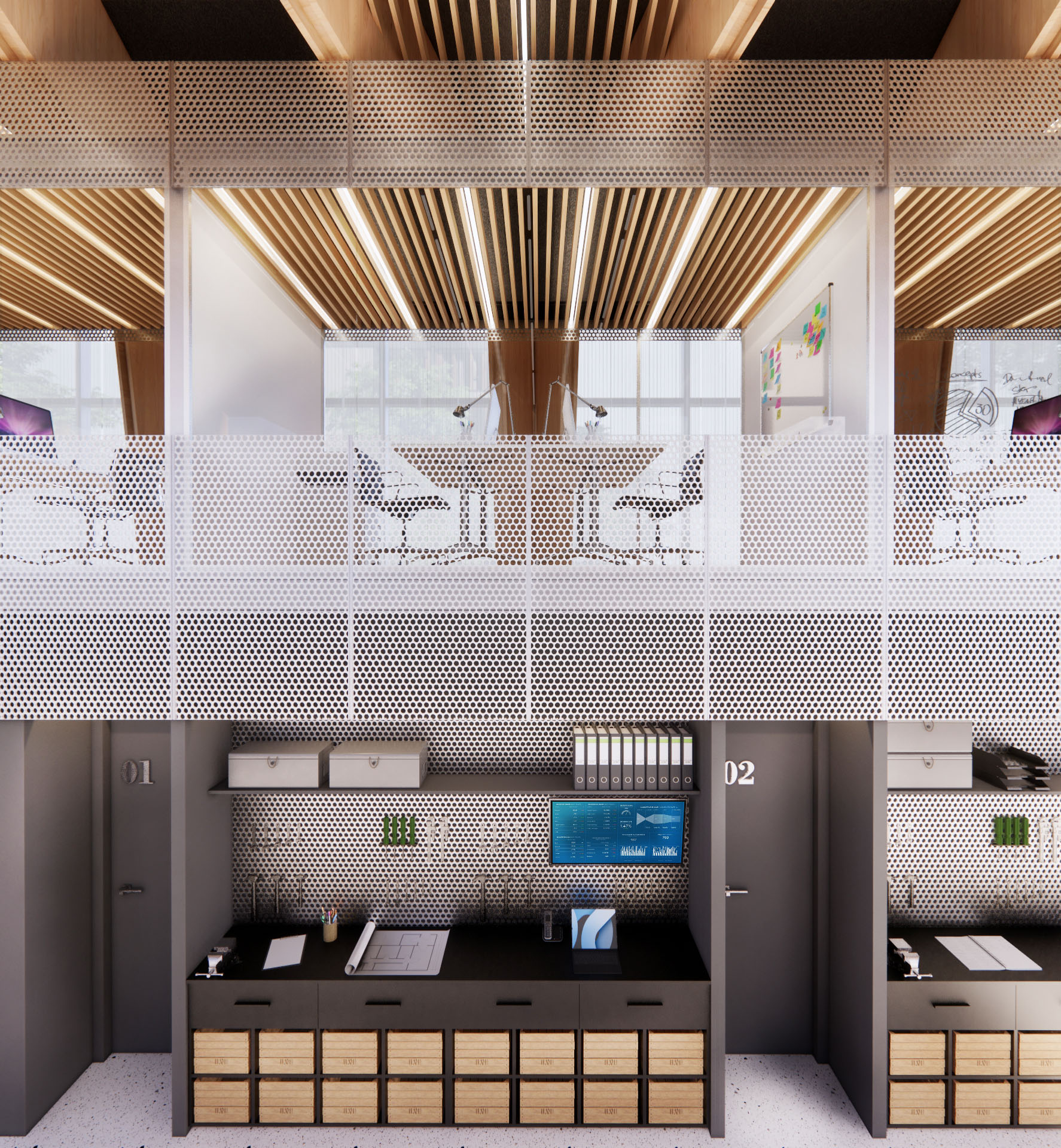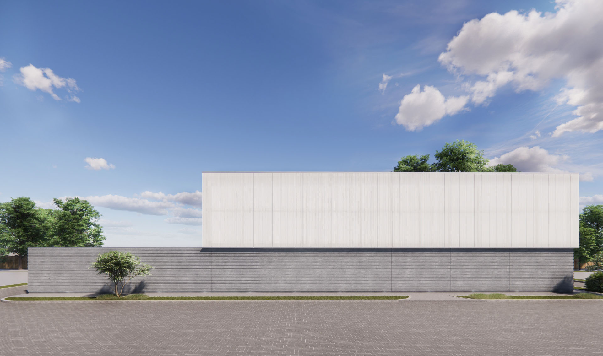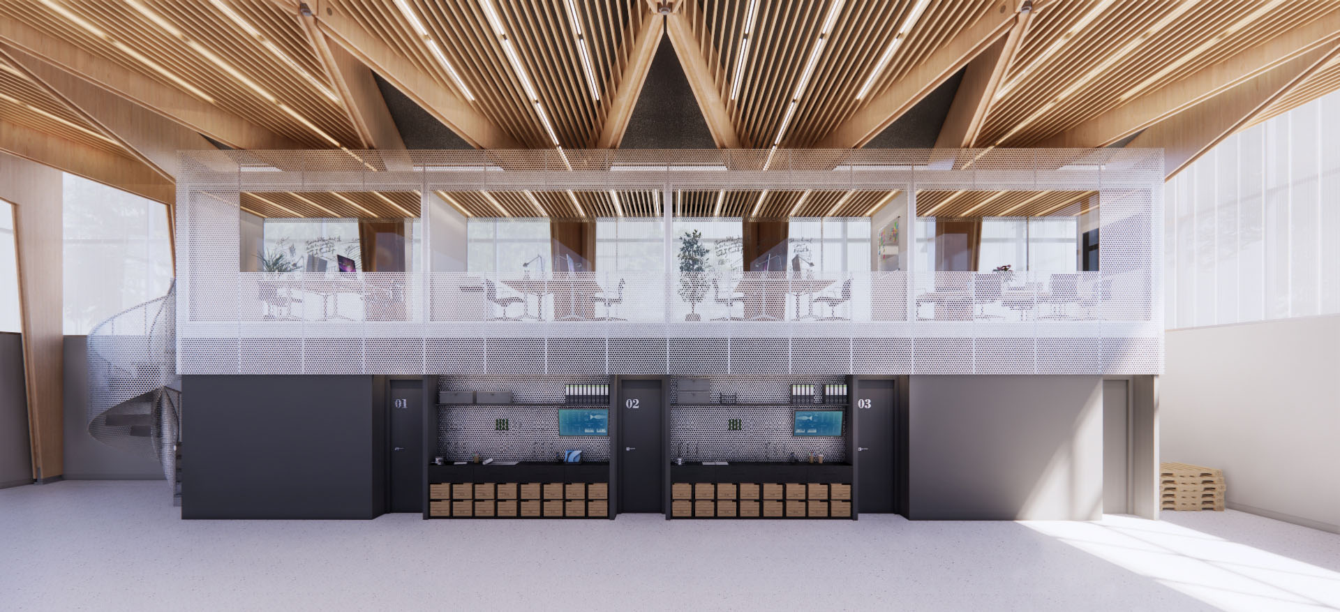 The lower third of the factory has a timber frame structure clad in ribbed GRC panels horizontally oriented with a mix of smooth and rough finish. The panels extends past the building, providing definition to the entrance yard, used as a parking area as well as loading bay.