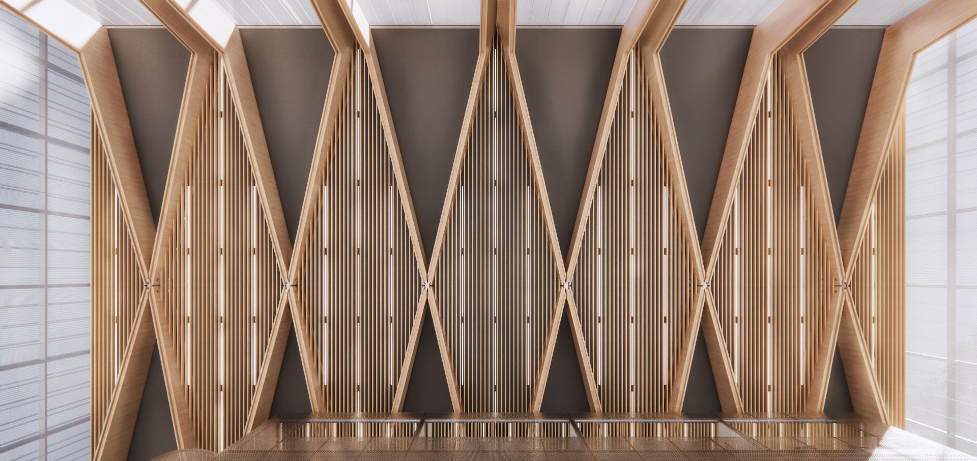 The clear outer appearance of the building is combined with a hall construction of constrained frame members that are shaped and twisted geometrically as well as spatially.