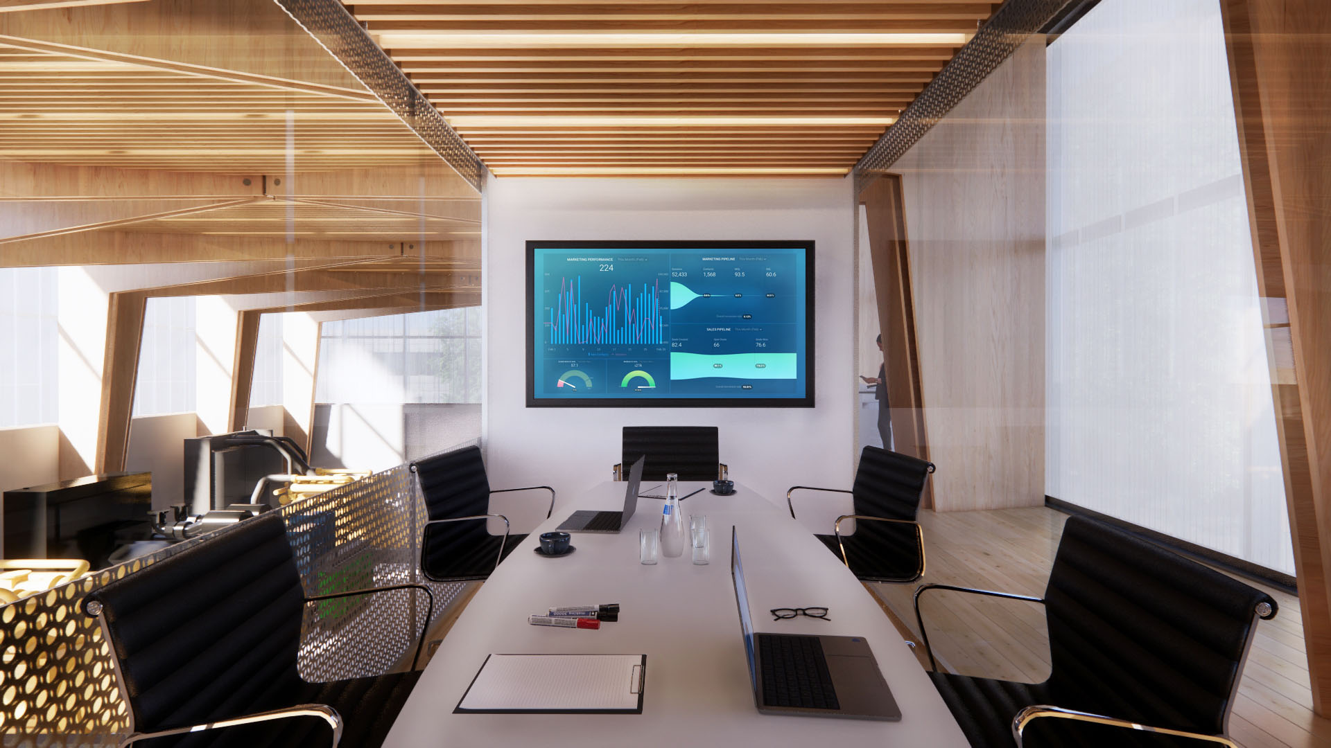 The upper part of the volume, a double skin translucent screen of polycarbonate sheets, filters the light that enters the building providing a bright and comfortable working environment.