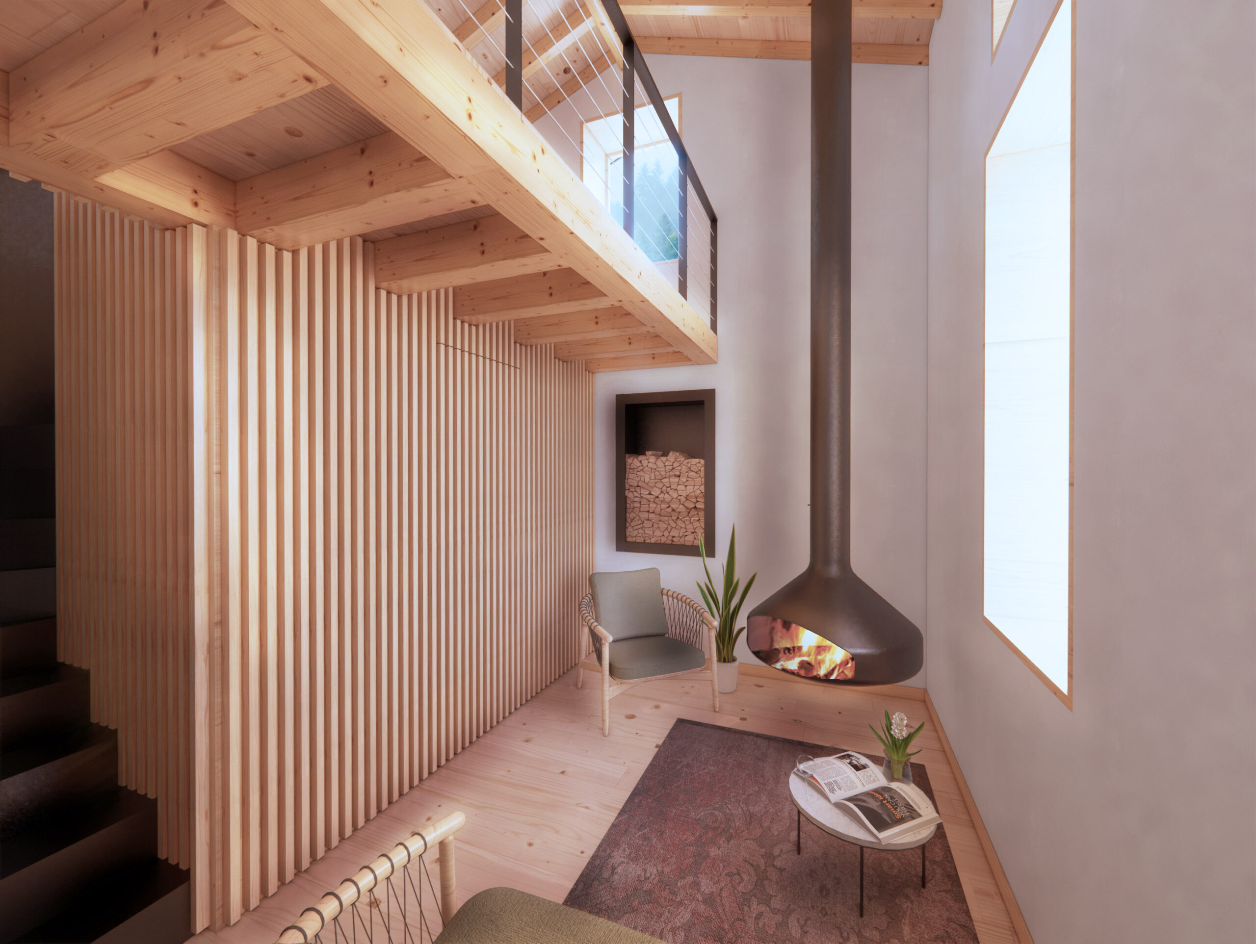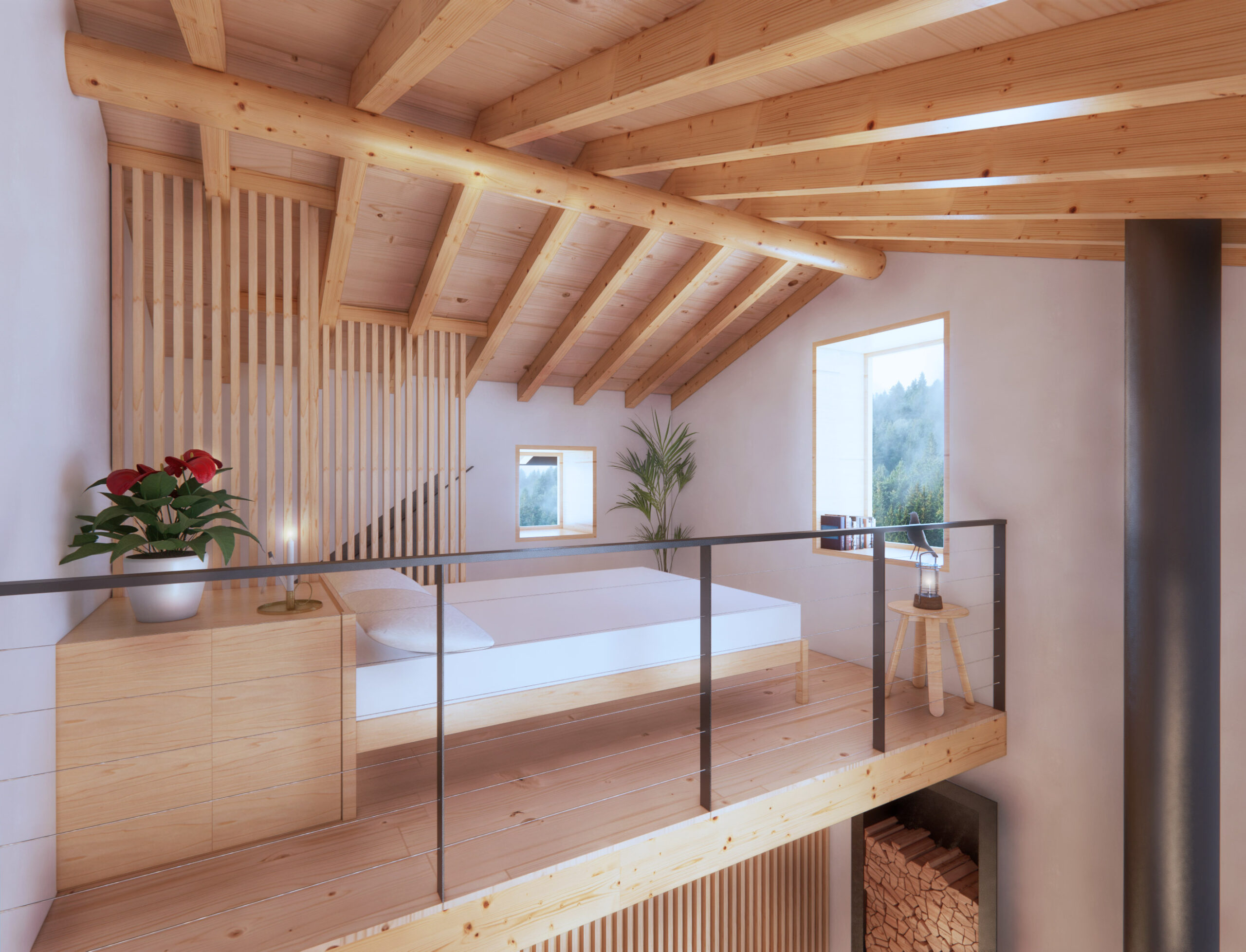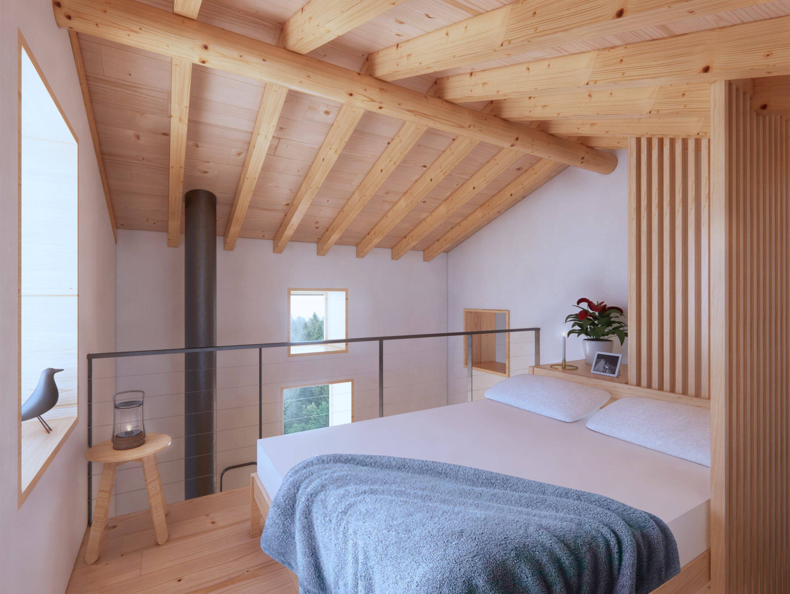 A new modern bathroom has been added following the requirements of the client. The new mezzanine will host a cozy master bedroom; fir planks have been used as lining to the new walls.