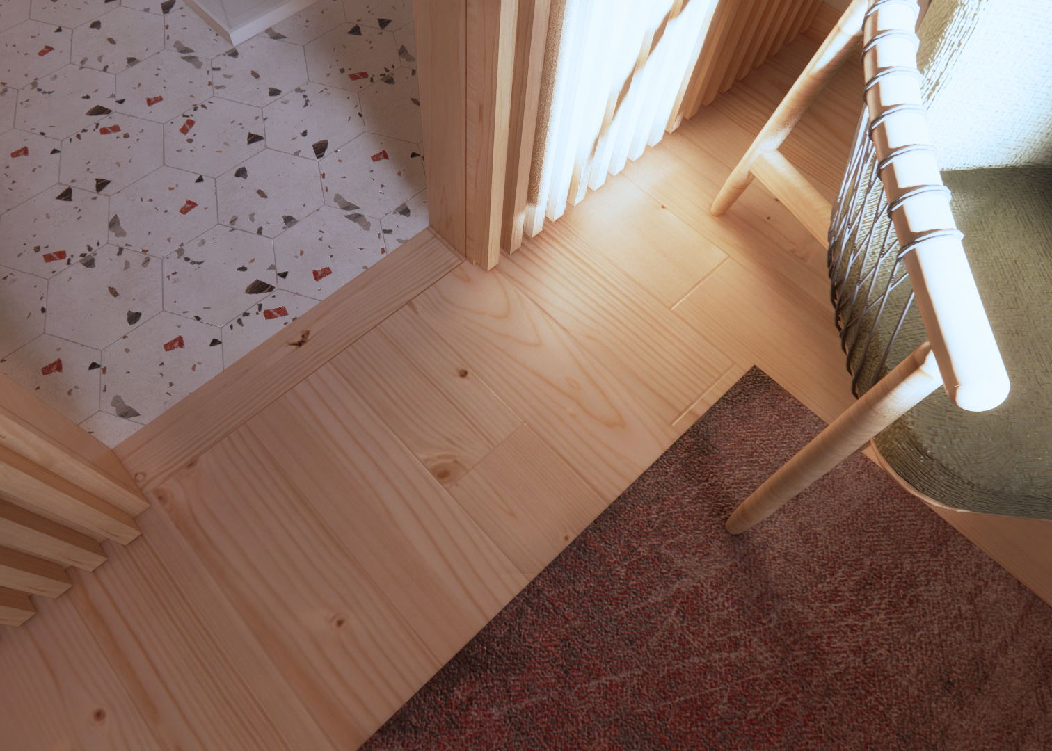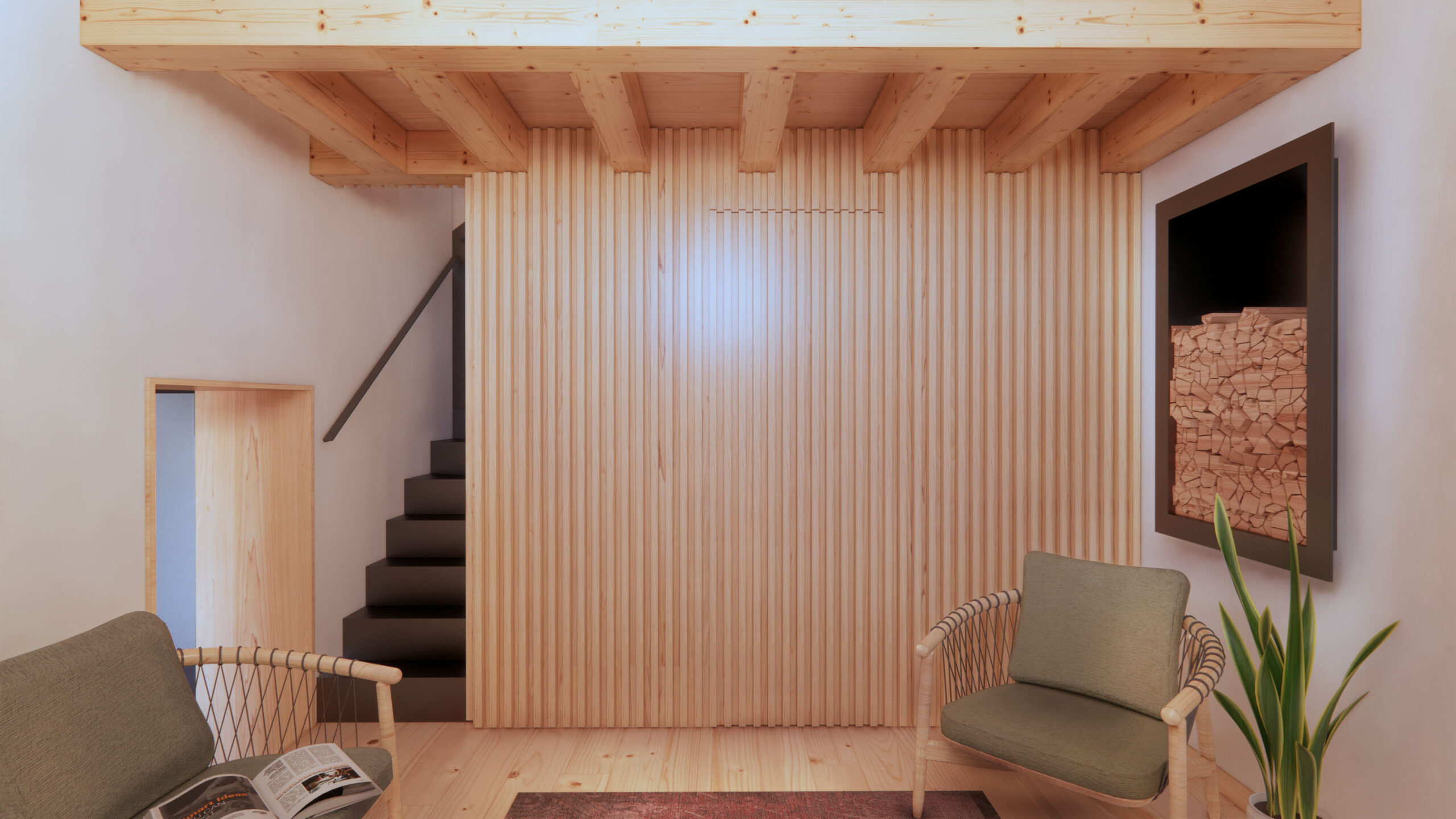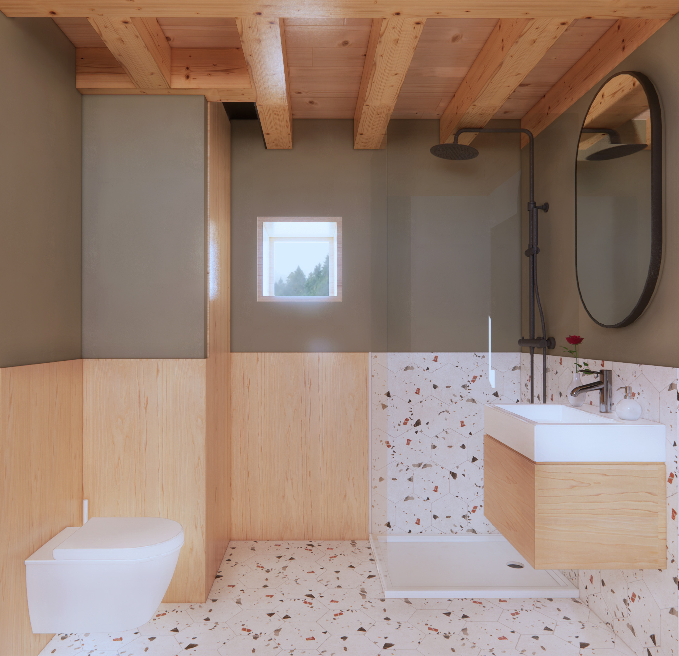 A new modern bathroom has been added following the requirements of the client. The new mezzanine will host a cozy master bedroom; fir planks have been used as lining to the new walls.