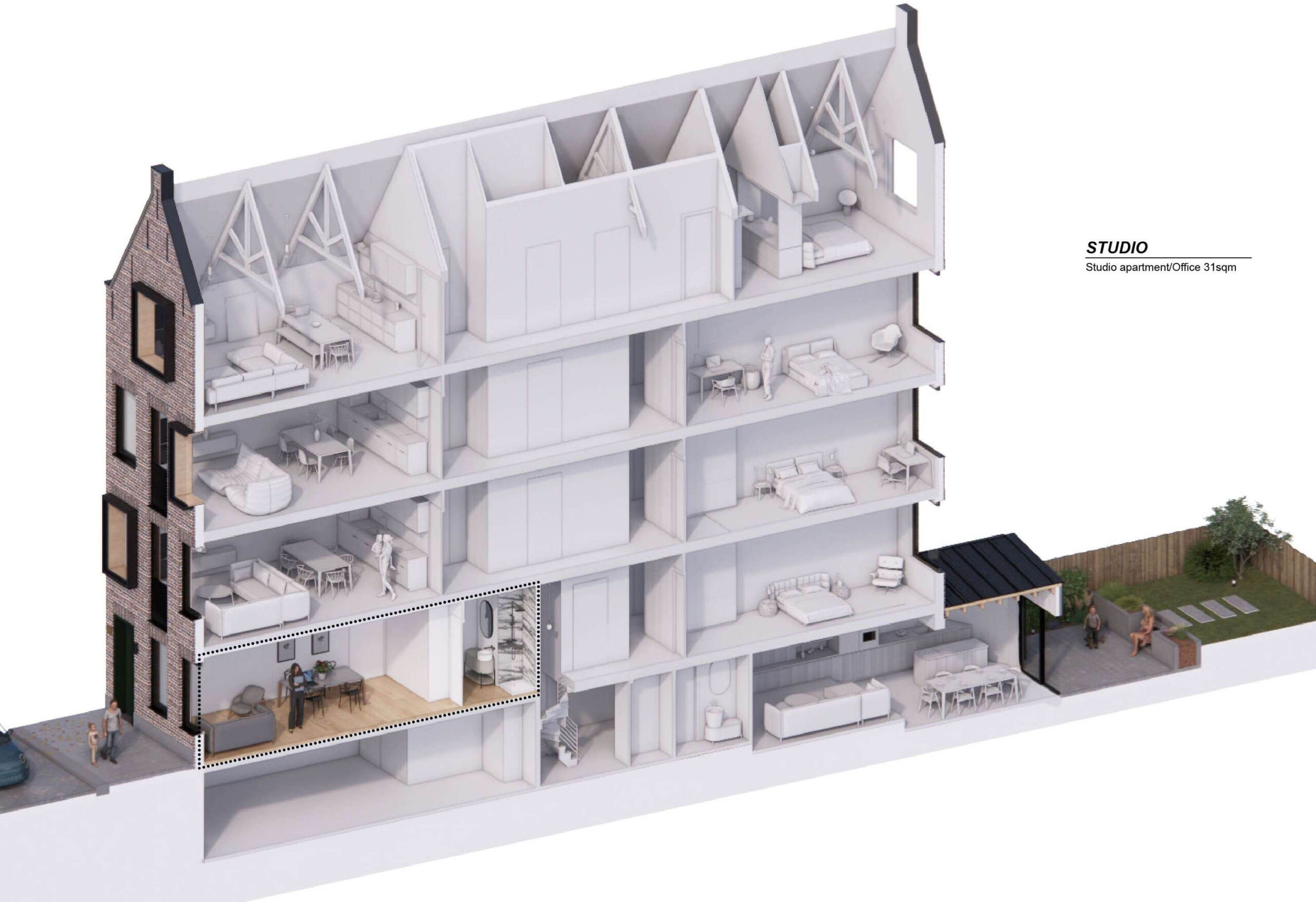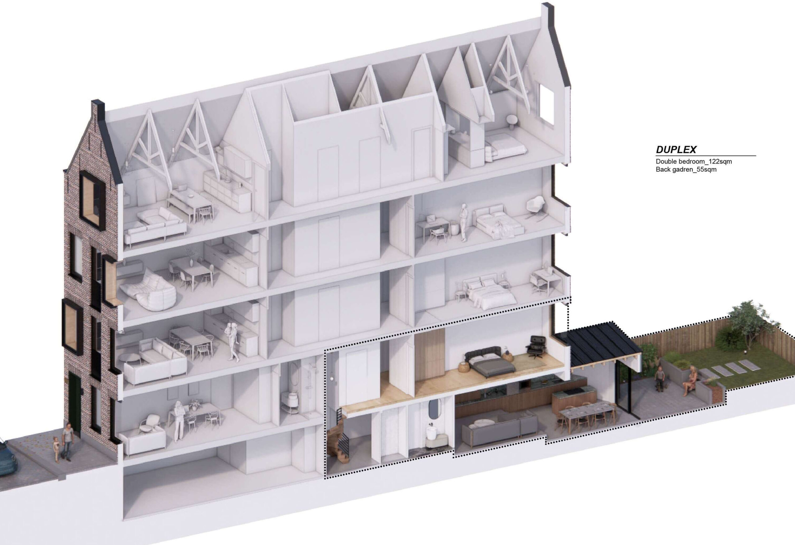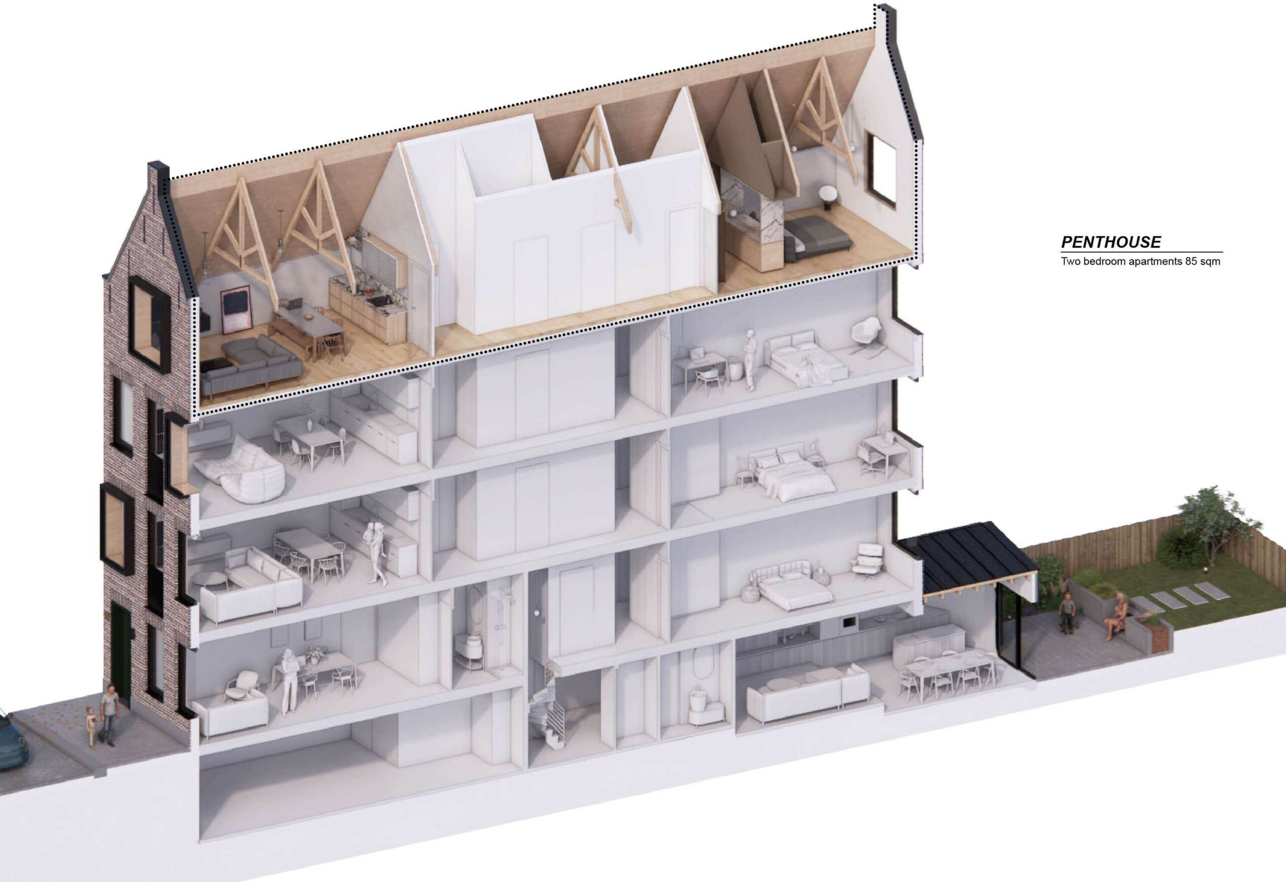 Inside, we reimagined the entire interior space to create a harmonious blend of living options. The final design that follow the client requests, features a luxurious duplex apartment, a charming studio apartment, two spacious two-bedroom apartments, and a magnificent penthouse on the top floor, each with its unique character and charm.