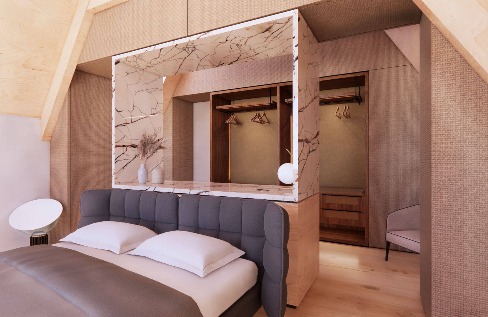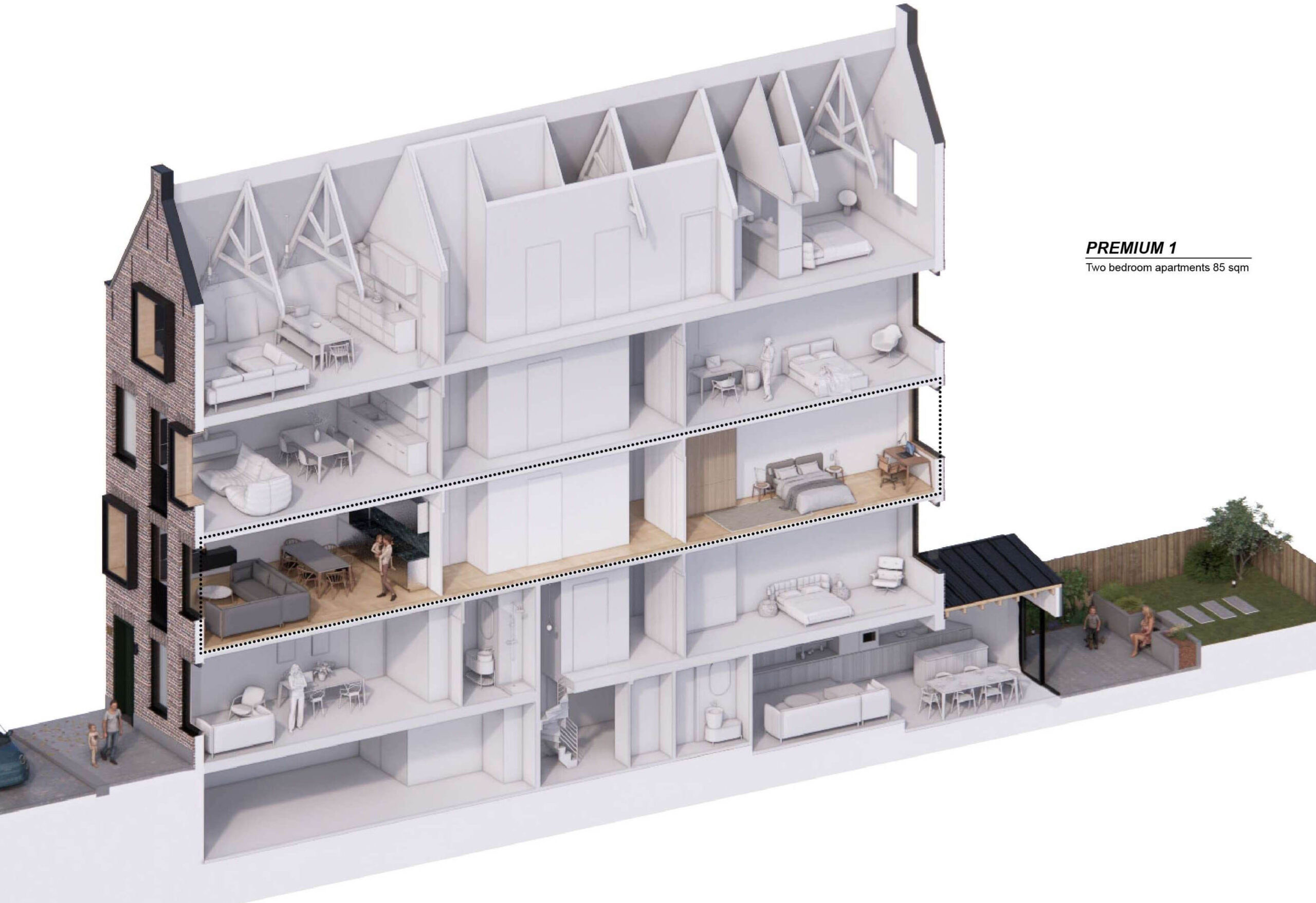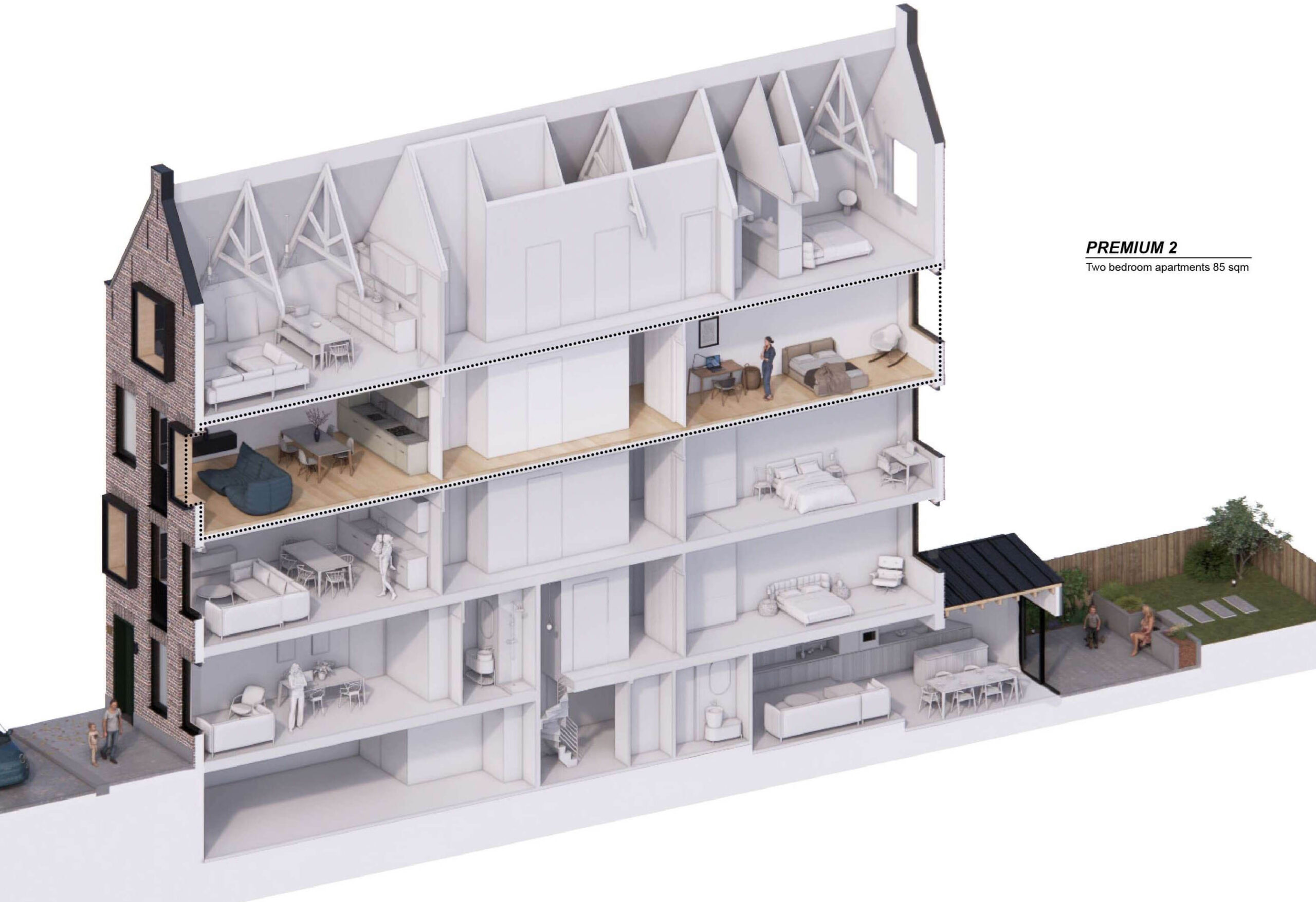 Inside, we reimagined the entire interior space to create a harmonious blend of living options. The final design that follow the client requests, features a luxurious duplex apartment, a charming studio apartment, two spacious two-bedroom apartments, and a magnificent penthouse on the top floor, each with its unique character and charm.