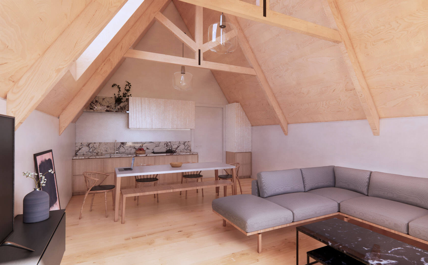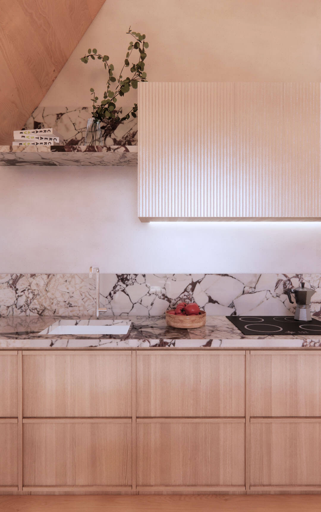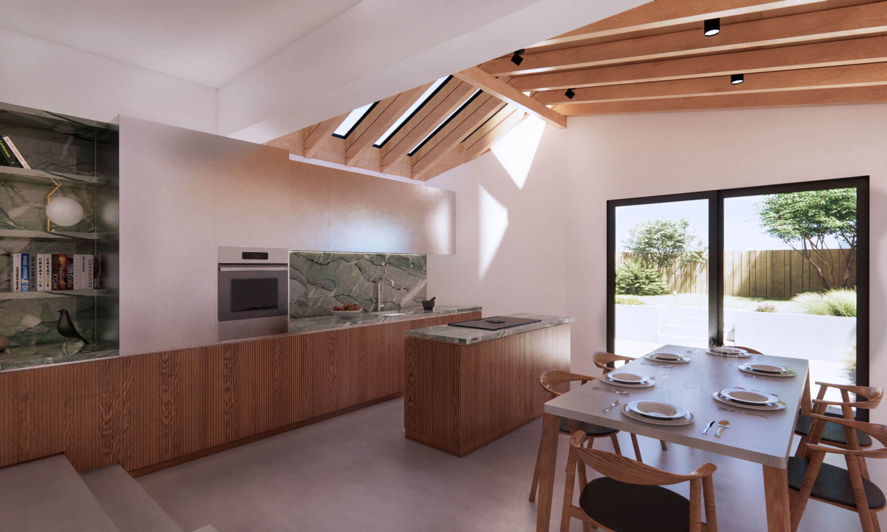 Additionally, at the client's request, we extended the building's rear façade to optimize space and natural light. Our commitment to natural materials, including birch, chestnut, larch, and oak for joinery, various types of marble for countertops, polished concrete, and natural oak for the floors.