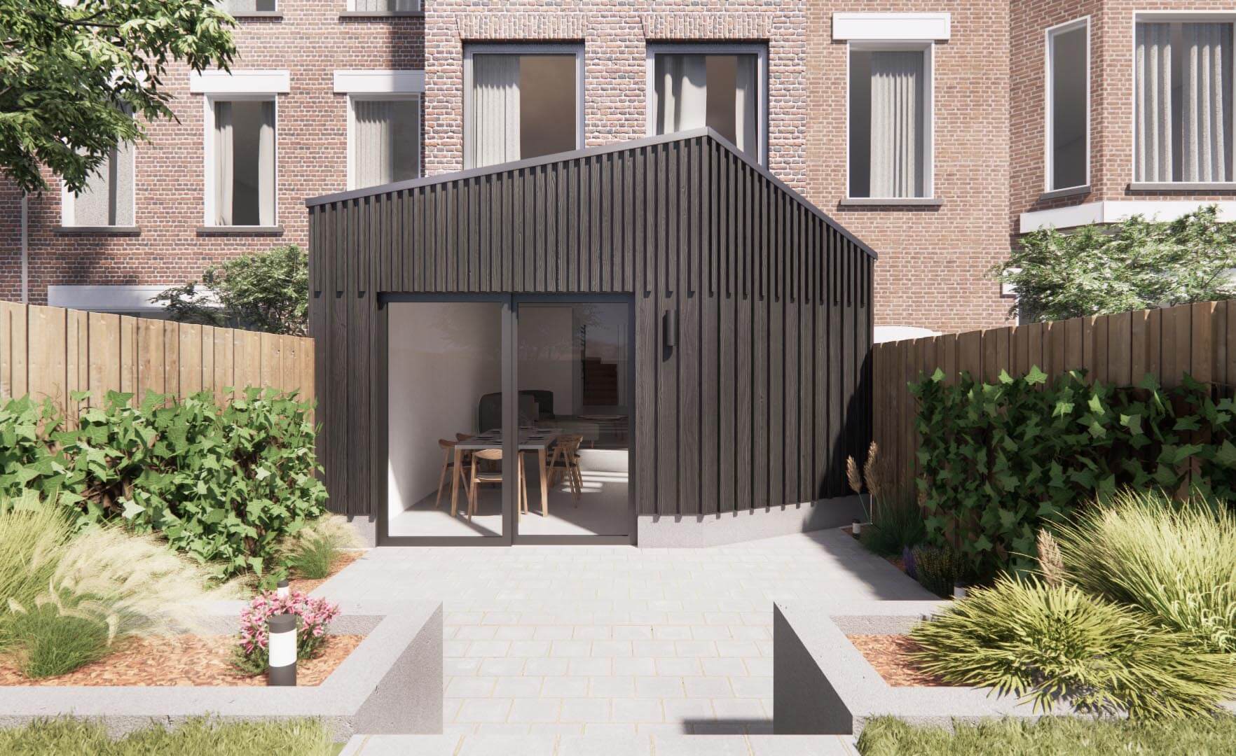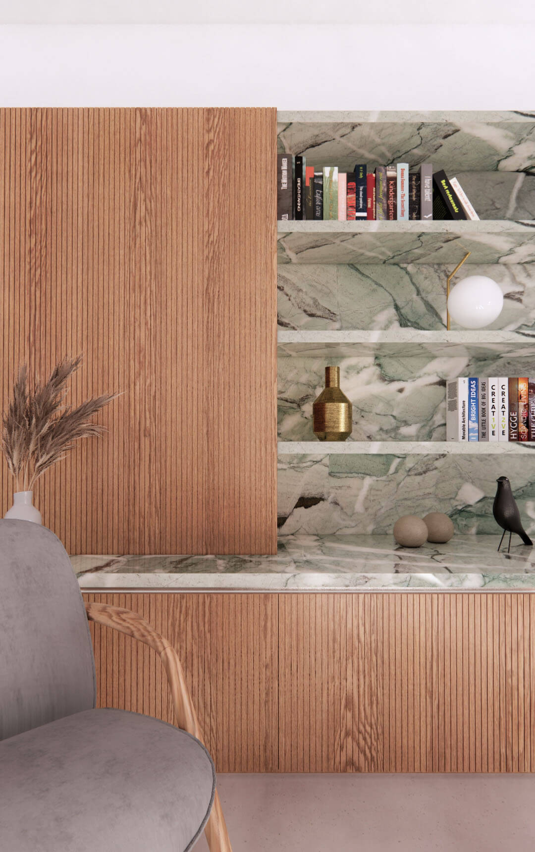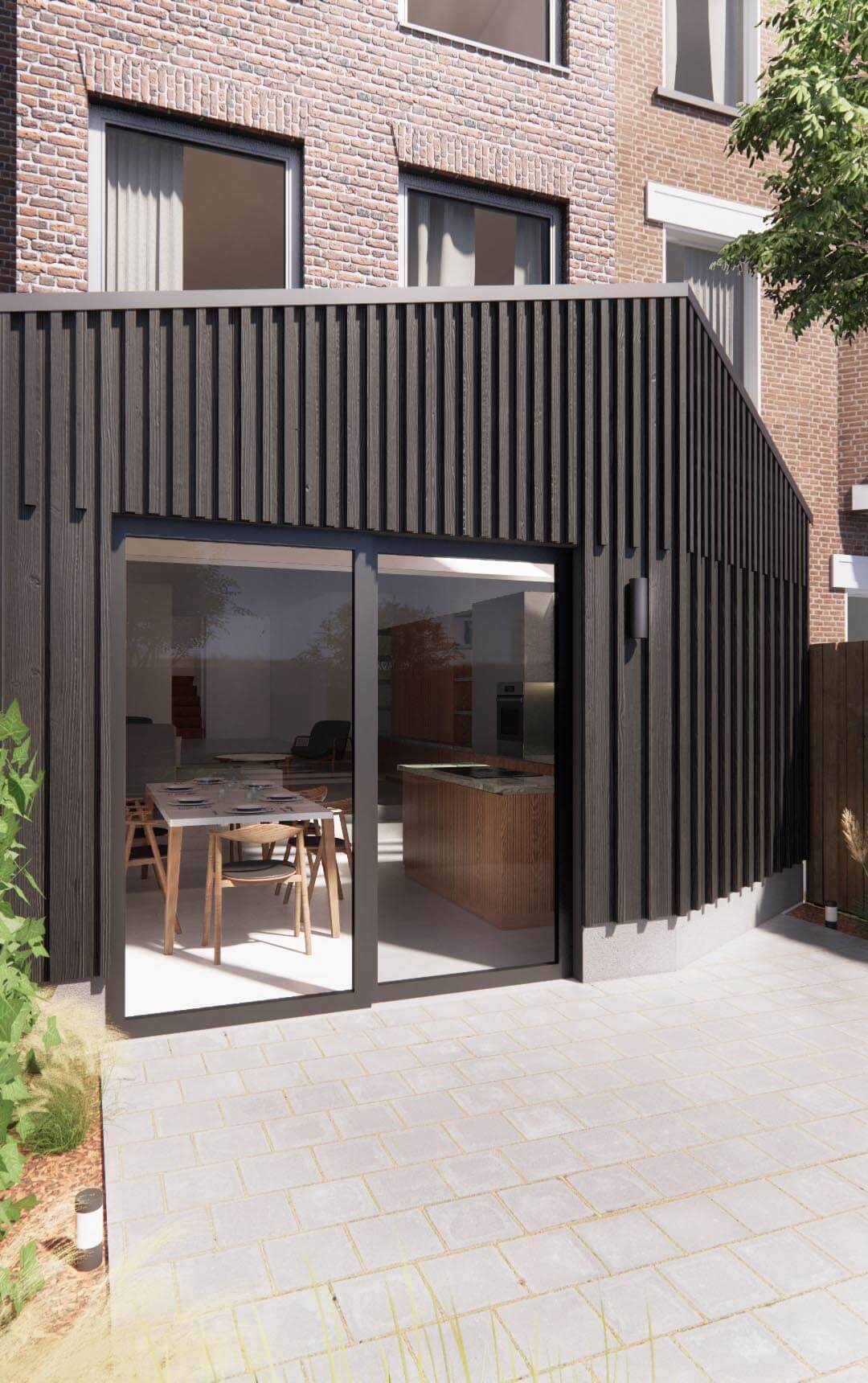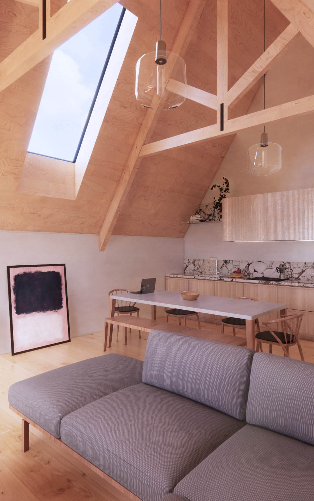 Additionally, at the client's request, we extended the building's rear façade to optimize space and natural light. Our commitment to natural materials, including birch, chestnut, larch, and oak for joinery, various types of marble for countertops, polished concrete, and natural oak for the floors.